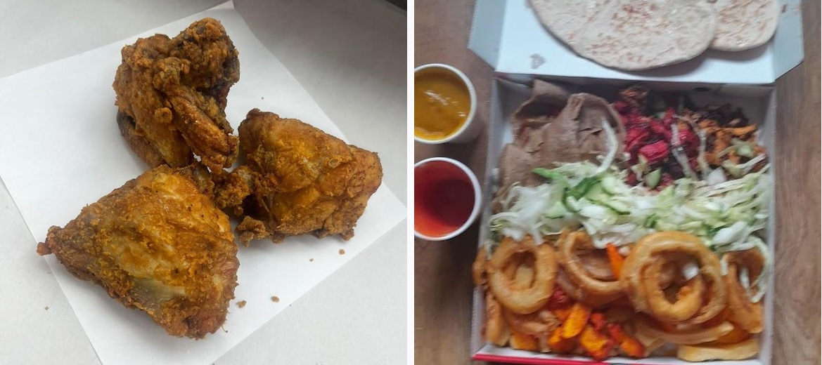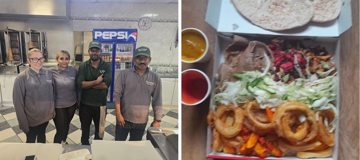 The Bridge Fish Bar specializes in fish and chips, kebabs, southern fried chicken, and pizzas. Each dish is cooked fresh for a delightful meal.
